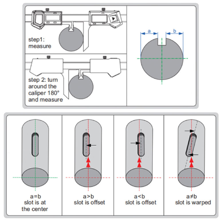 - Används för att via mätning från båda hållen kontrollera kilspårets symmetri dvs att kilspårets läge/position är i centrum av axeln